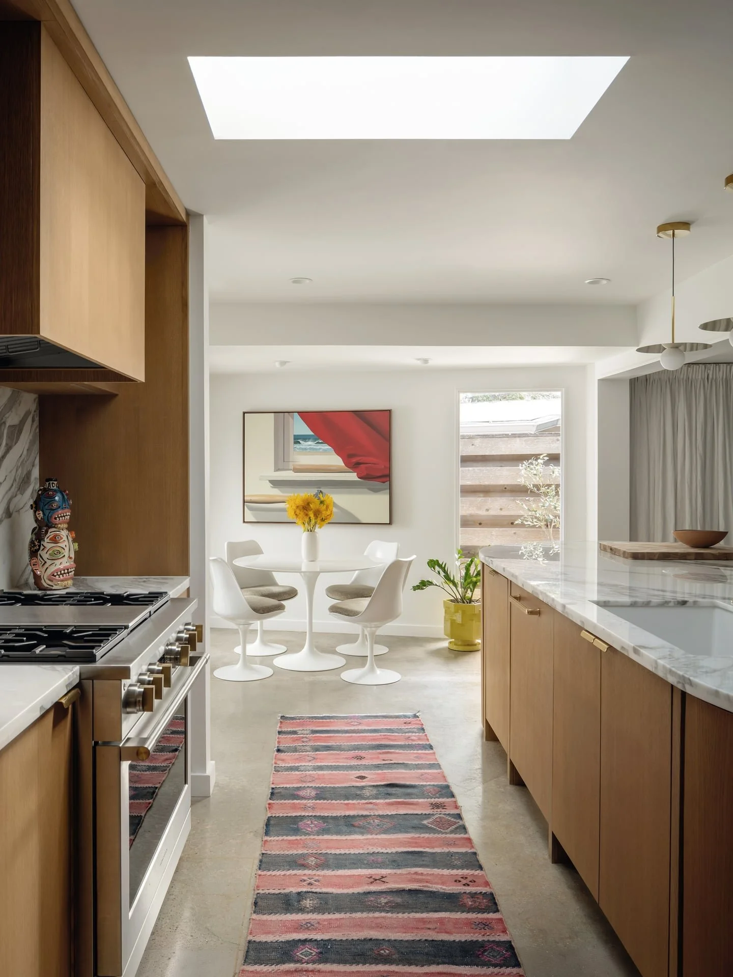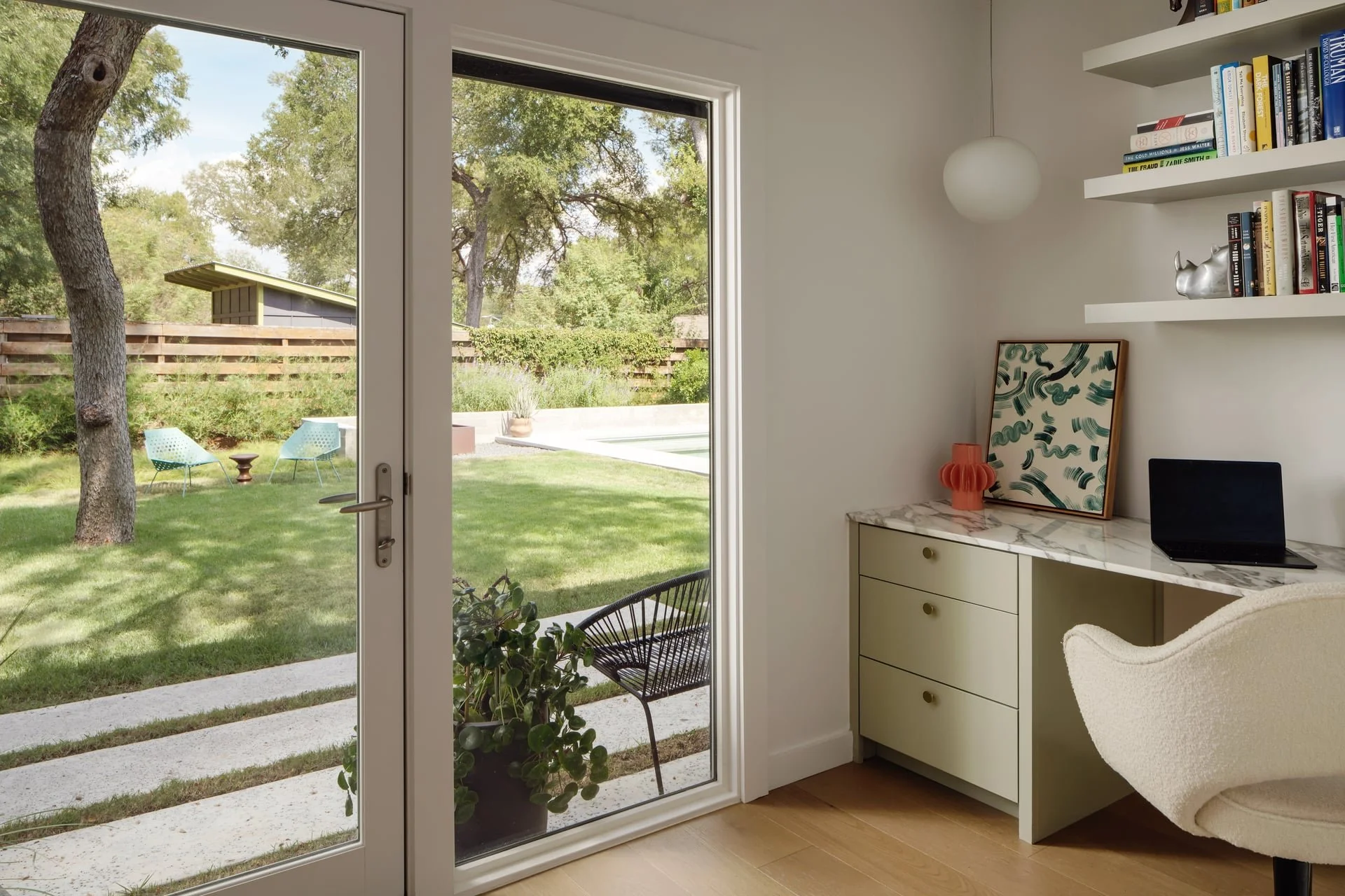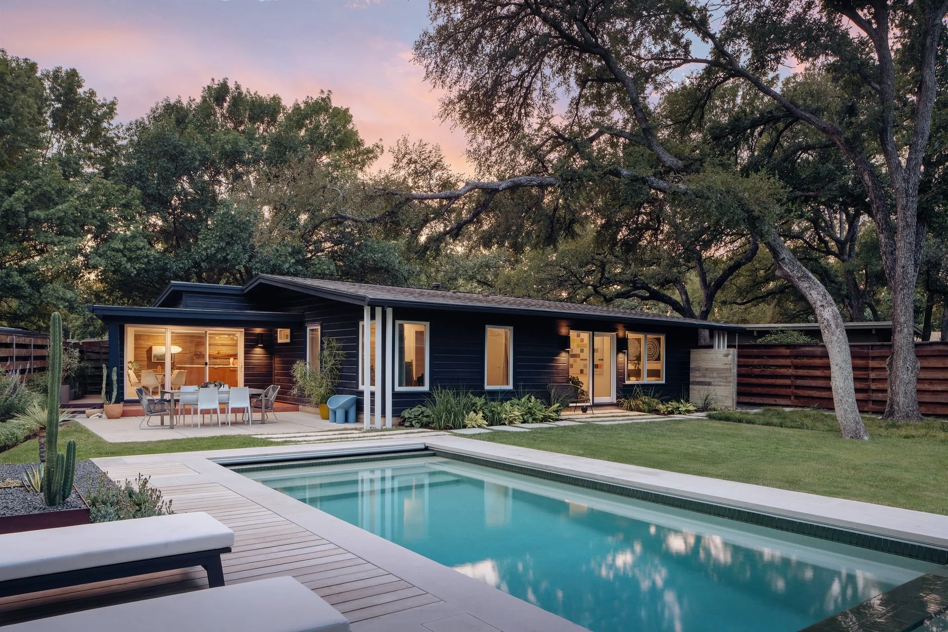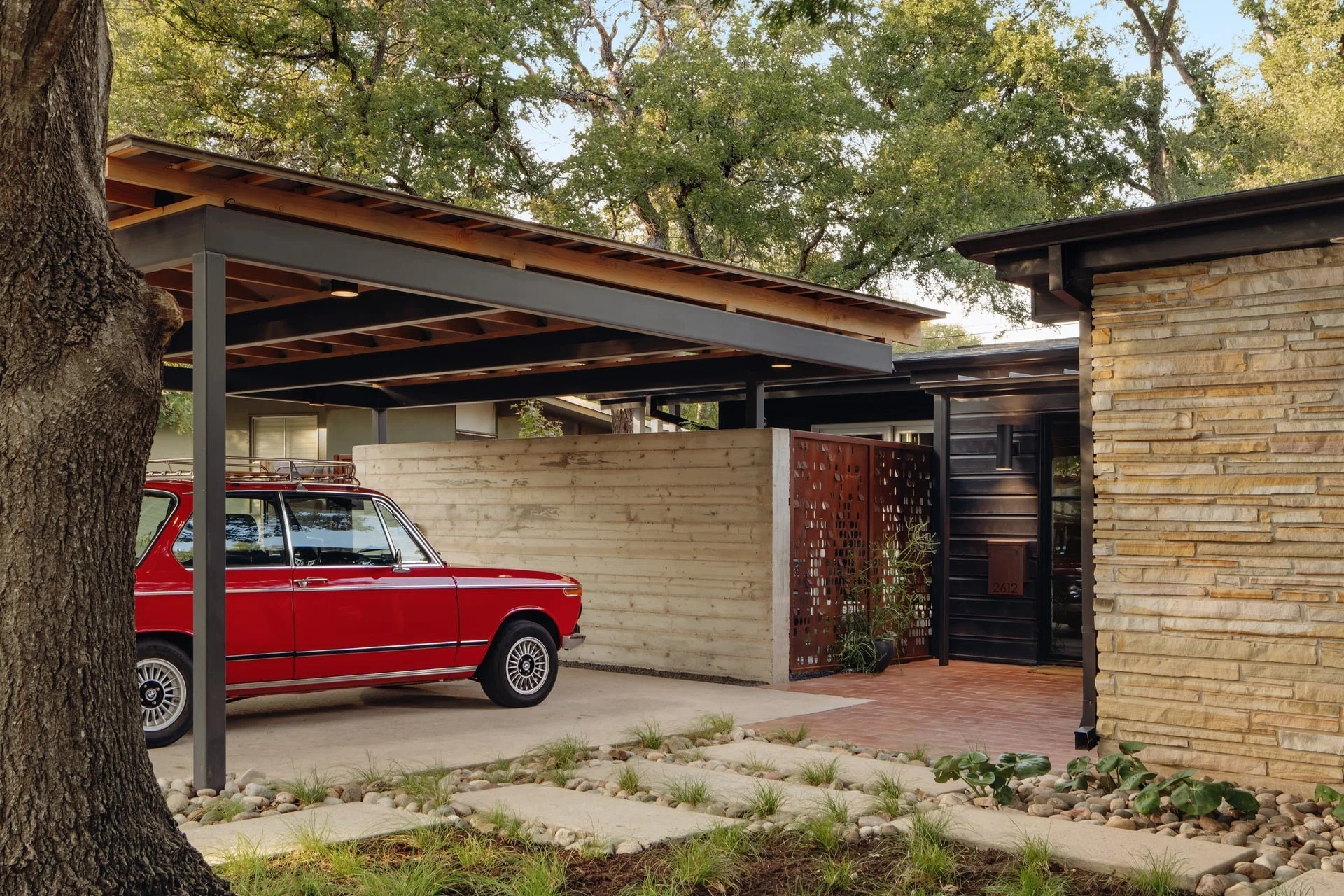 Our clients loved their neighborhood and large backyard with mature trees. With the addition of a new daughter, the house needed a better flow with connections to the outdoors. A sensible budget forced us to stay within the original footprint and envelope. We captured the existing front porch creating a more inviting entry from the street, and peeled off a cramped laundry room at the back to open the kitchen to the backyard and new pool. We removed a load-bearing wall between the kitchen and living room, and installed a generous island that is a main gathering spot. We cannibalized an interior bedroom to provide another route to the backyard along with a laundry room and built-in workspace. The addition of a carport with exposed timbers and paint grip roof and board-formed concrete wall give the house more presence, while creating a cozy private courtyard to the primary suite.