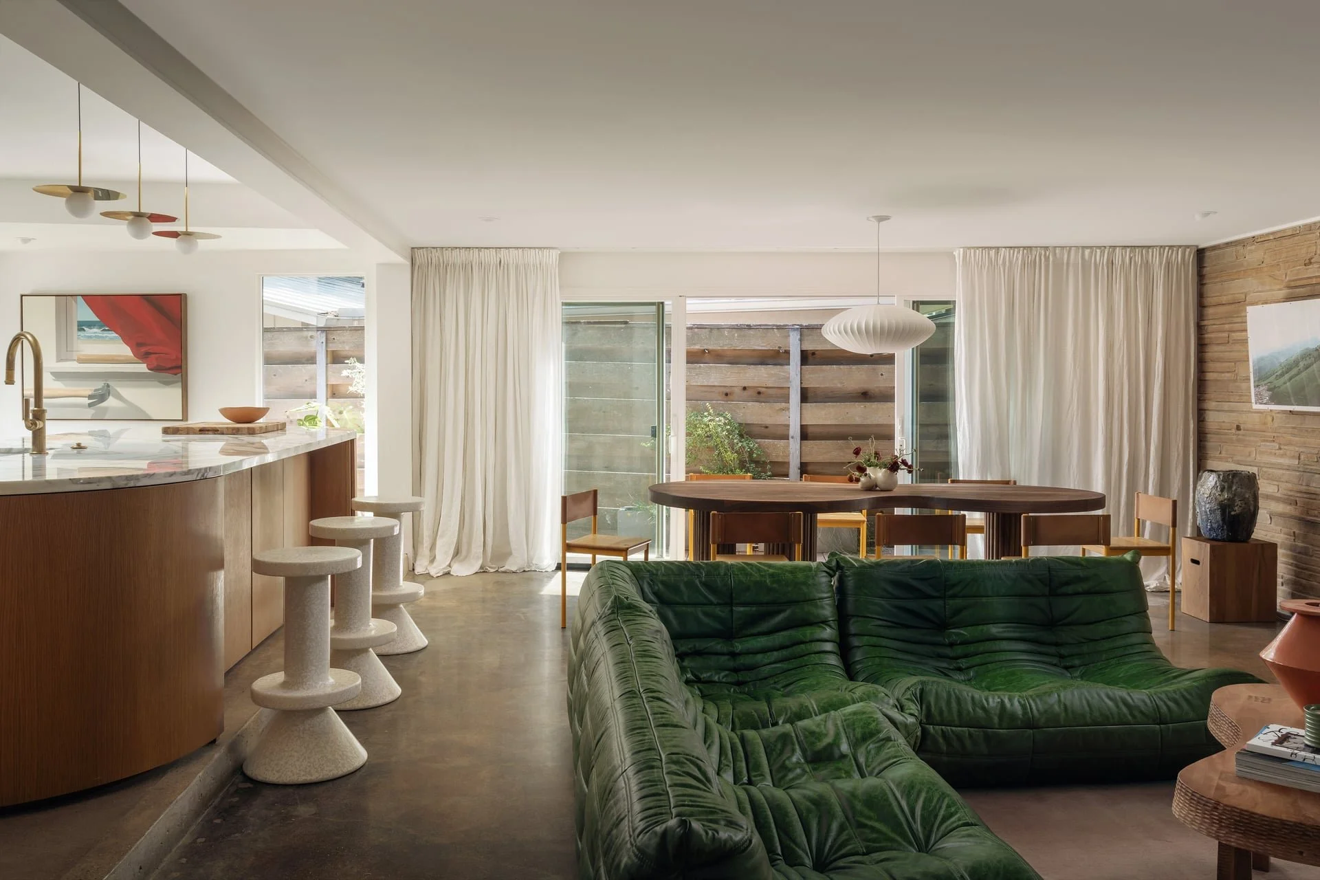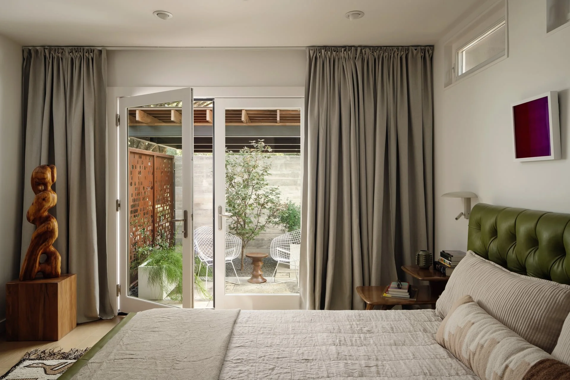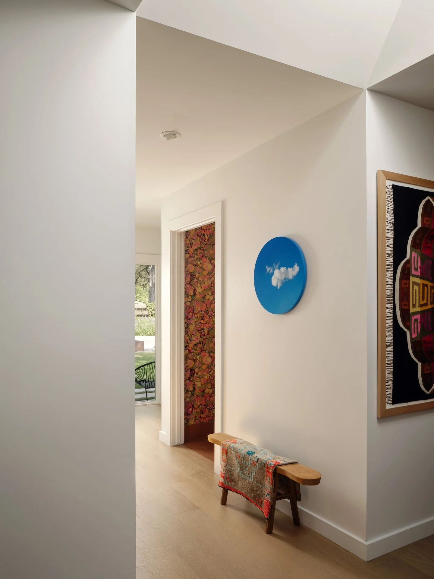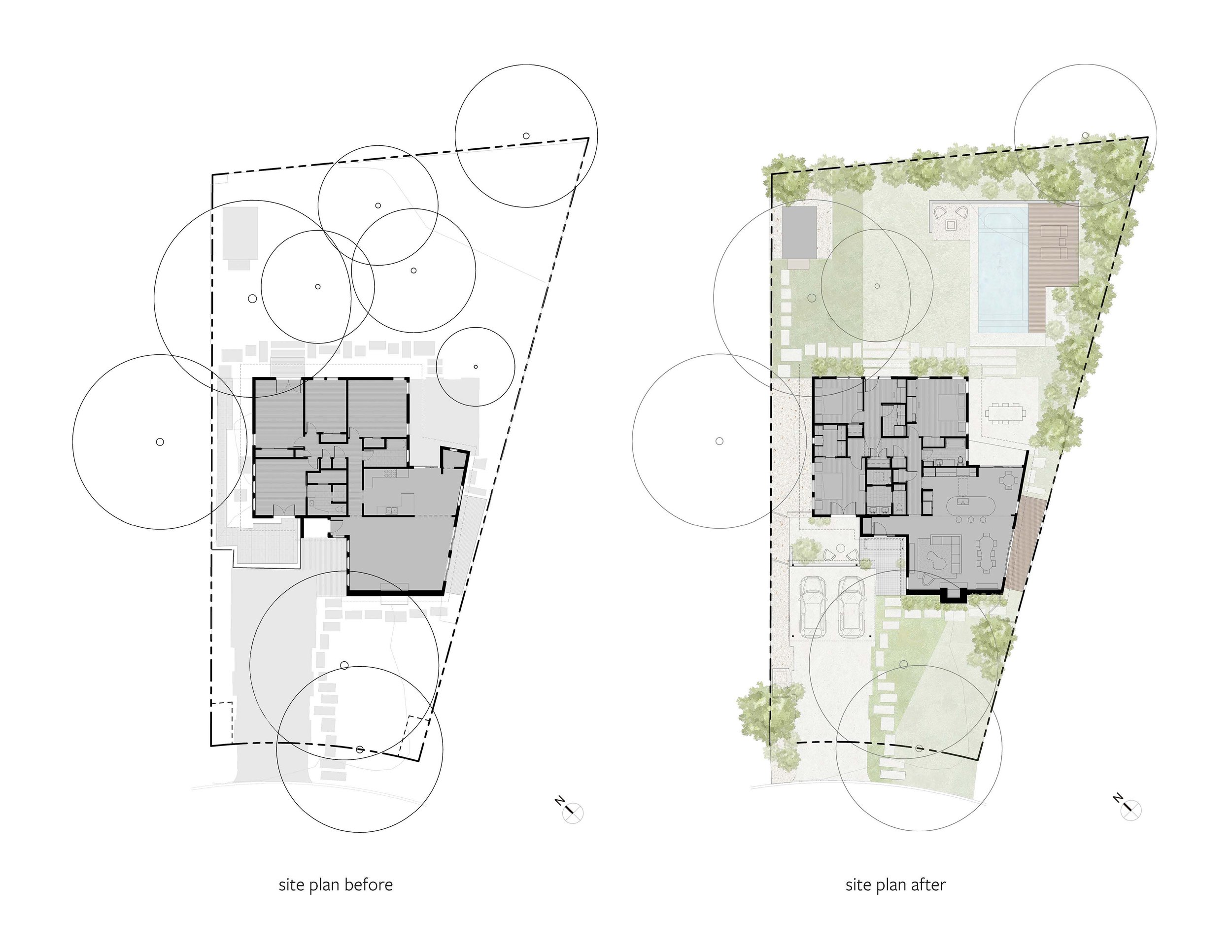 Our clients loved their neighborhood and large backyard with mature trees. With the addition of a new daughter, the house needed a better flow with connections to the outdoors. A sensible budget forced us to stay within the original footprint and envelope. We captured the existing front porch creating a more inviting entry from the street, and peeled off a cramped laundry room at the back to open the kitchen to the backyard and new pool. We removed a load-bearing wall between the kitchen and living room, and installed a generous island that is a main gathering spot. We cannibalized an interior bedroom to provide another route to the backyard along with a laundry room and built-in workspace. The addition of a carport with exposed timbers and paint grip roof and board-formed concrete wall give the house more presence, while creating a cozy private courtyard to the primary suite.